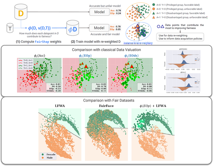 Pipeline and results of Fair Shapley ValuesAlgorithmic fairness is of utmost societal importance, yet state-of-the-art largescale machine learning models require training with massive datasets that are frequently biased. In this context, pre-processing methods that focus on modeling and correcting bias in the data emerge as valuable approaches. In this paper, we propose FairShap, a novel instance-level data re-weighting method for fair algorithmic decision-making through data valuation by means of Shapley Values. FairShap is model-agnostic and easily interpretable. It measures the contribution of each training data point to a predefined fairness metric. We empirically validate FairShap on several state-of-the-art datasets of different nature, with a variety of training scenarios and machine learning models and show how it yields fairer models with similar levels of accuracy than the baselines. We illustrate FairShap’s interpretability by means of histograms and latent space visualizations and perform a utility-fairness study. We believe that FairShap represents a promising direction in interpretable and model-agnostic approaches to algorithmic fairness that yield competitive accuracy even when only biased datasets are available