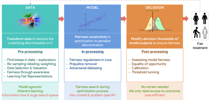 Schema of the Main Algorithmic Fairness mitigation methodsLos modelos de aprendizaje automático se están convirtiendo en las principales herramientas para abordar problemas sociales complejos y también se utilizan cada vez más para tomar o apoyar decisiones sobre los individuos en muchas áreas consecuentes de sus vidas, desde la justicia hasta la asistencia sanitaria. Por lo tanto, es necesario tener en cuenta las implicaciones éticas de tales decisiones, incluyendo conceptos como la privacidad, la transparencia, la responsabilidad, la fiabilidad, la autonomía y la equidad. En concreto, explicaremos el panorama actual de la equidad en la IA, desde las fuentes del sesgo y los diferentes enfoques algorítmicos de la equidad hasta sus limitaciones y enfoques de vanguardia. El objetivo principal es proporcionar una visión general de lo que es la equidad, así como los principales retos de investigación que la comunidad tiene que abordar.
